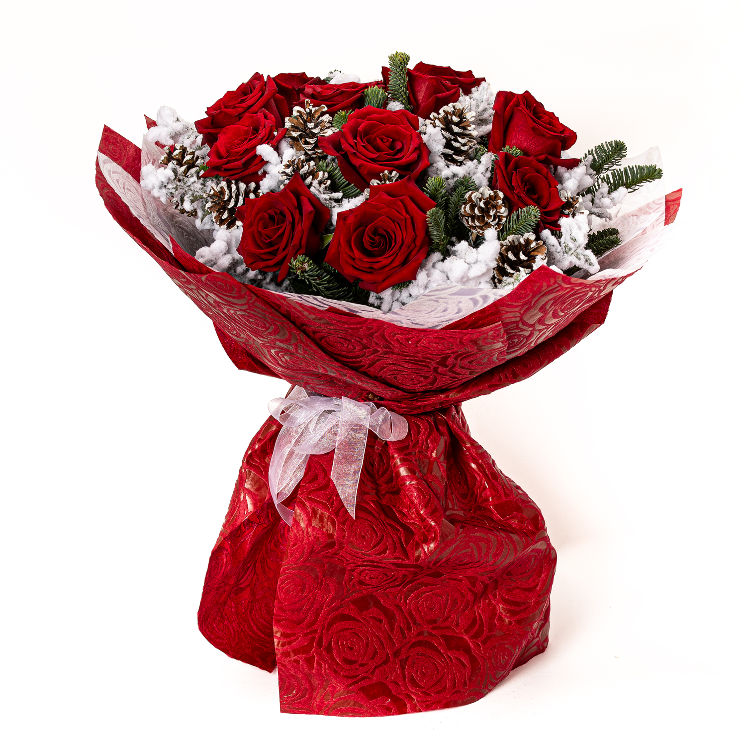 A bouquet of 11 fresh red Ecuador roses, frosted branches, and Christmas foliage, beautifully wrapped in an impressive presentation.
