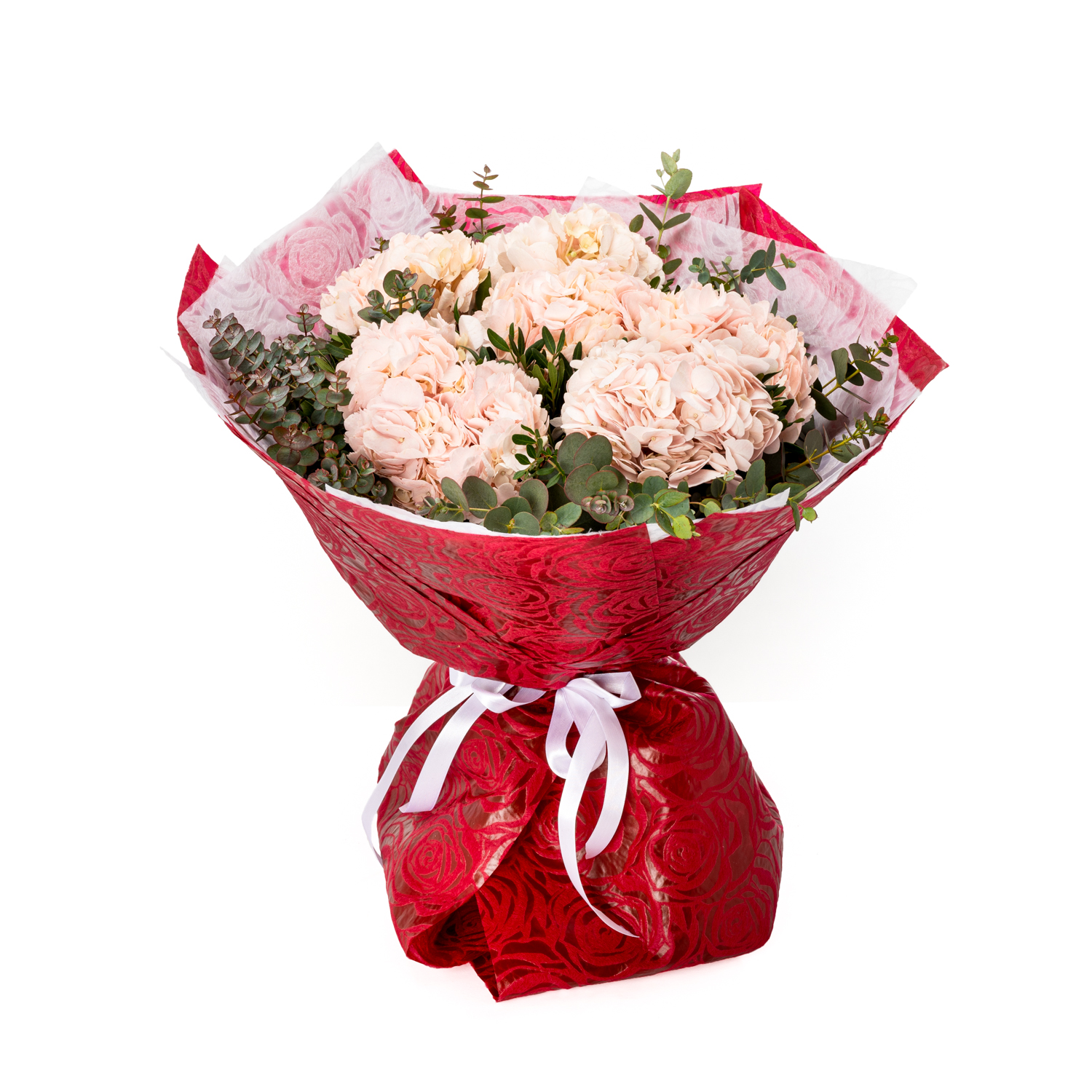 Six salmon hydrangeas and seasonal foliage in a bouquet.