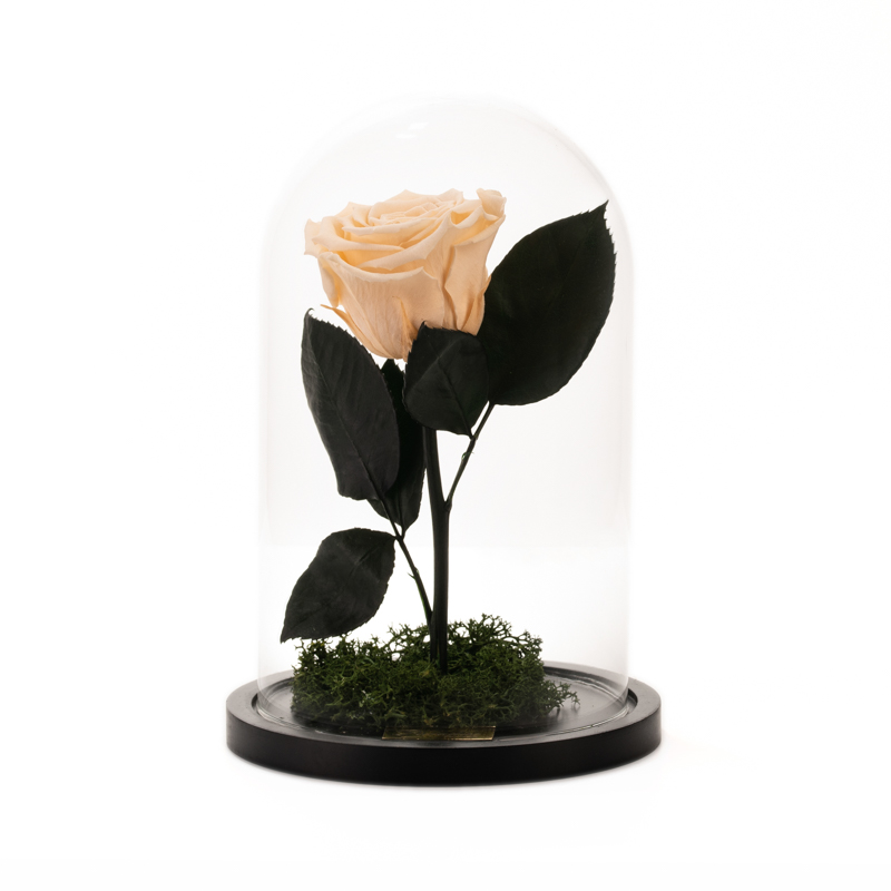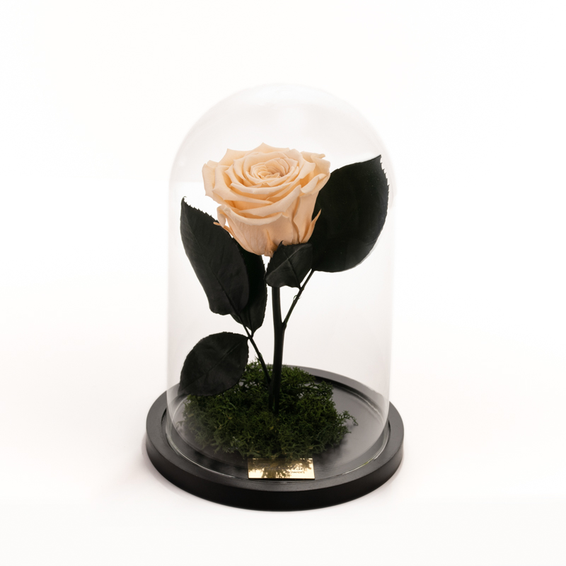 Blue Eternity rose in a dome, in ivory color in a glass dome. Lifespan of at least two years, with simple care. Avoid extreme temperatures, humidity and direct sunlight exposure. Dimensions: Ø14 x 21 cm