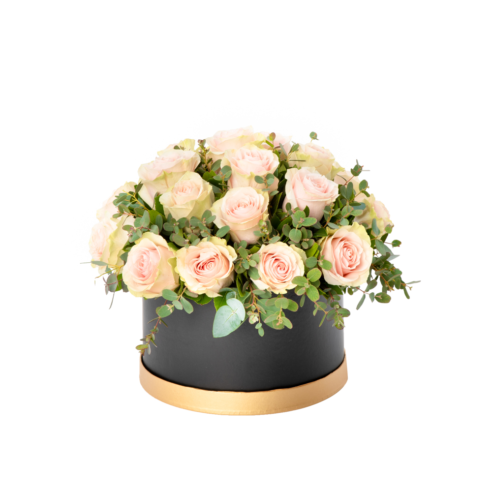 .Fresh pink roses and seasonal foliage in a black-gold round box. Dimensions: Ø35 x 35 cm