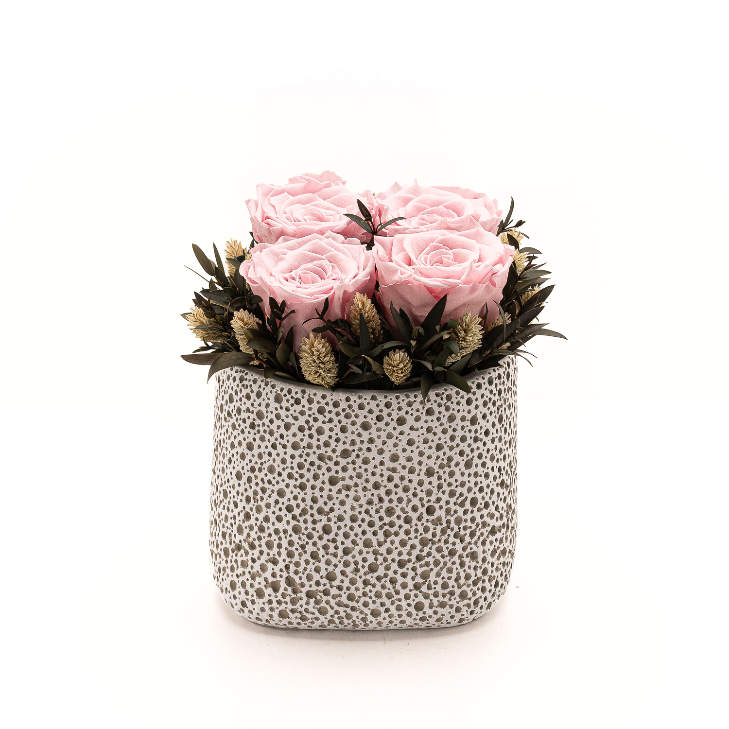 Ceramic cachepot with four eternity roses in pink colour. Lifespan of at least two years, with simple care. Avoid extreme temperatures, humidity and direct sunlight exposure. Dimensions: Ø16 x 19 cm