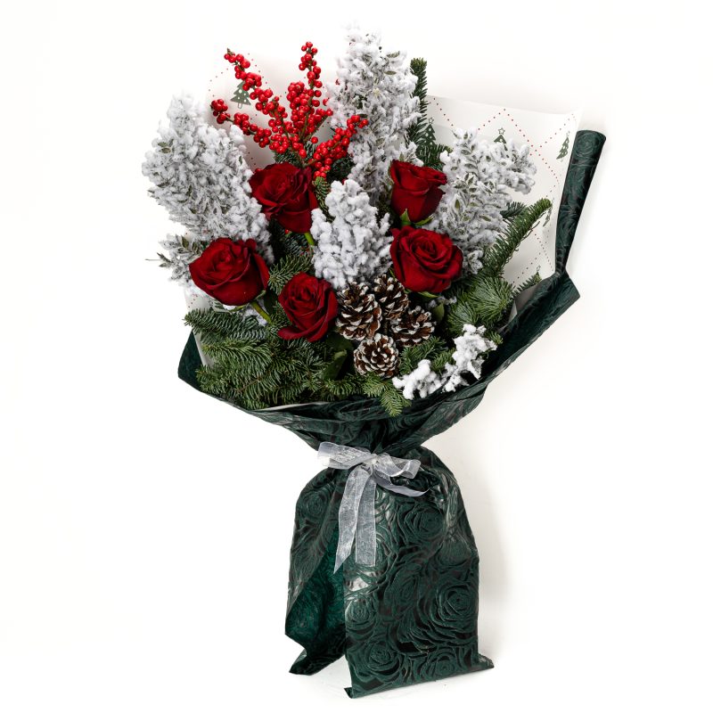 A bouquet of 5 fresh red Ecuador roses, ilex, frosted branches, and Christmas foliage, beautifully wrapped in an impressive presentation.