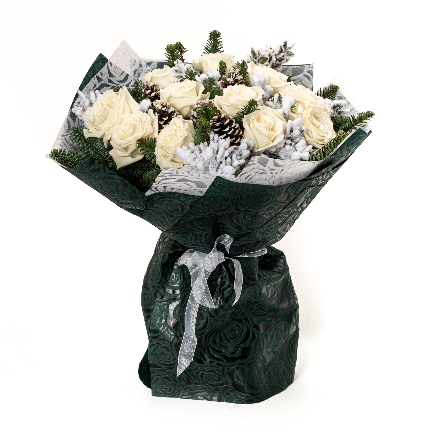 A bouquet of 11 fresh white Ecuador roses, frosted branches, and Christmas foliage, beautifully wrapped in an impressive presentation.