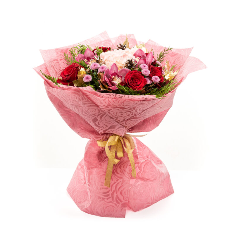 Fresh, seasonal flowers, pine cones and foliage in a bouquet. In red, pink and golden colouring.