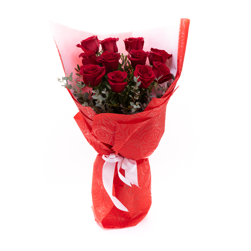 Ανθοδέσμη με 11 κόκκινα τριαντάφυλλα, πλαισιωμένα από διάφορα φυλλώματα και εντυπωσιακό αμπαλάζ.