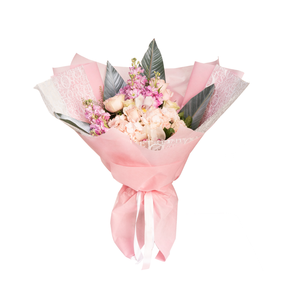 Ανθοδέσμη με λουλούδια εποχής, σε ροζ και λευκές αποχρώσεις, πλαισιωμένα από διάφορα φυλλώματα και εντυπωσιακό αμπαλάζ. Τα λουλούδια διαμορφώνονται αναλόγως την εποχή.
